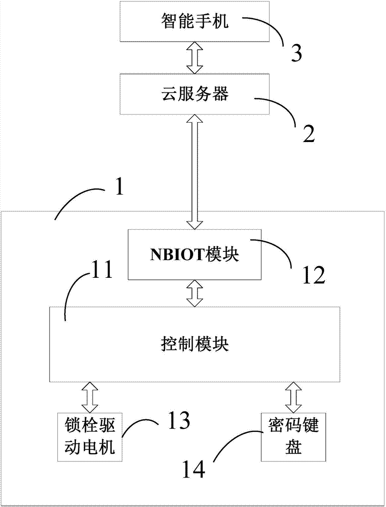 控制模塊11控制所述鎖體解鎖或鎖付,通信模塊12采用窄帶物聯網通信模塊(即NBIOT模塊),控制模塊11通過NBIOT模塊與一個云服務器2直接通信。因此,智能手機3就可以很快捷的通過云服務器2實現對互聯網智能門鎖1的運行與管理。